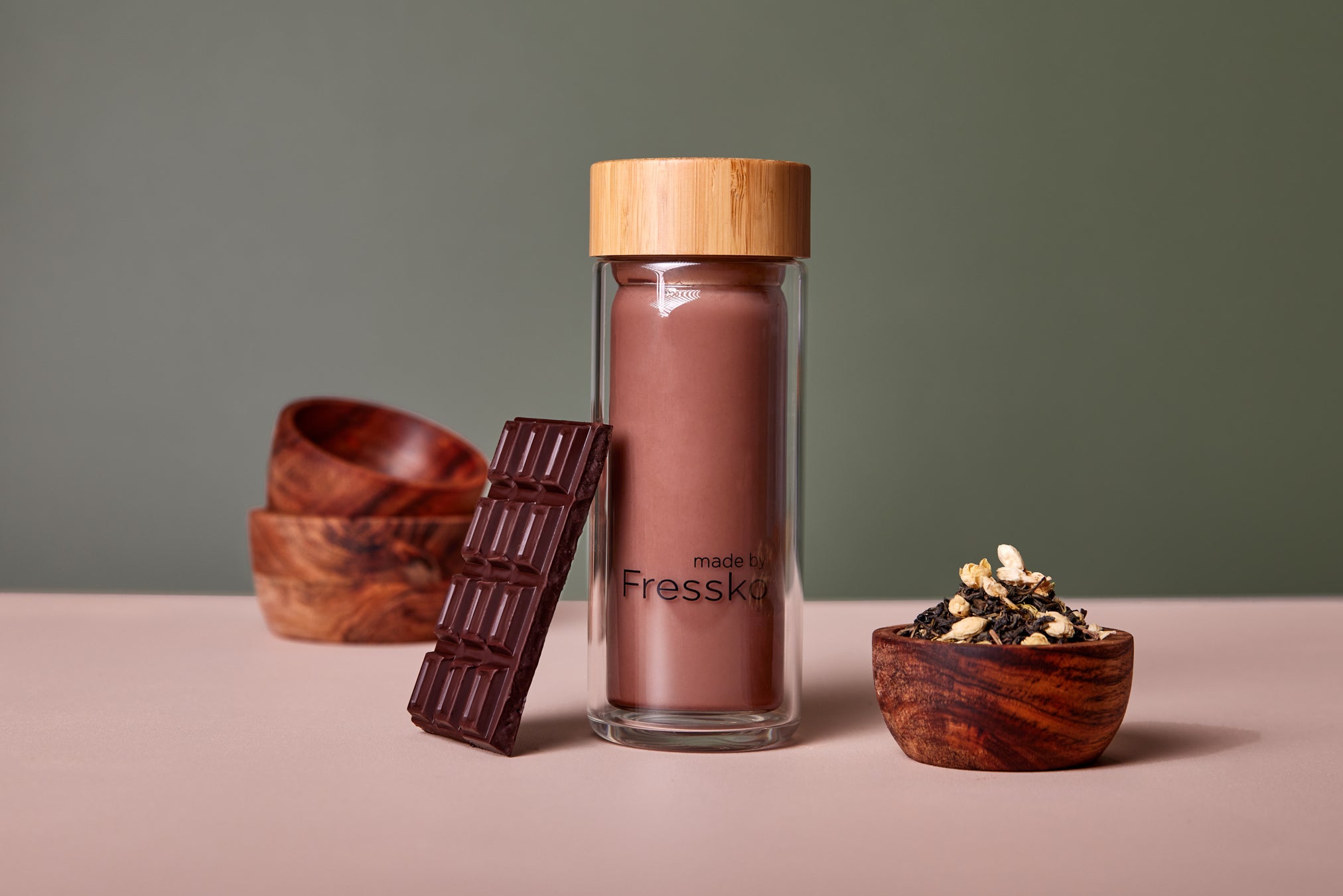 Add warmed milk, hot water and 1 heaped teaspoon of drinking chocolate into your Insulated Infuser flask and stir. Next, add loose-leaf tea into your 2-in-1 infuser, and click to secure it into place. Place on lid and let steep for 3 minutes.