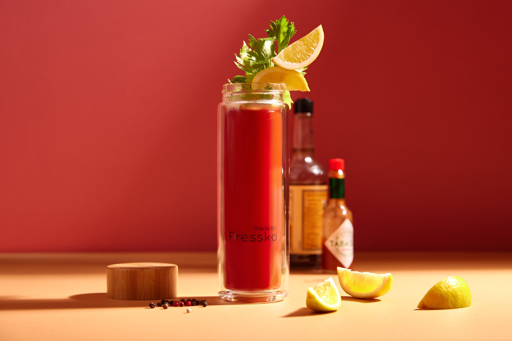 ✦ Add ice to your TOUR Fressko flask, along with vodka, tomato juice, lemon, Worcestershire sauce and tabasco sauce, salt and pepper.