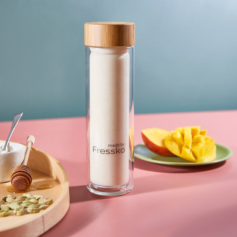 Put mango, coconut yogurt, nut mylk, honey and cardamom into a blender.