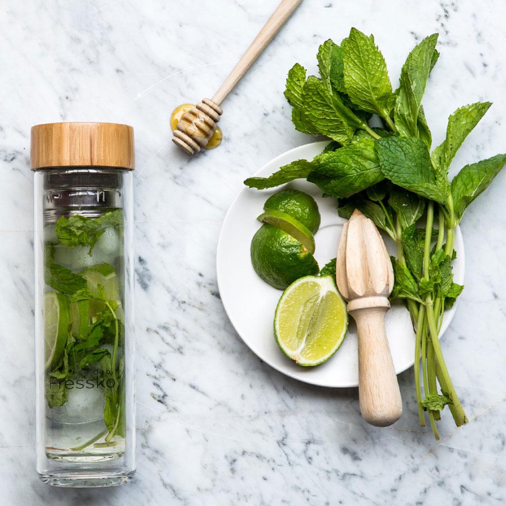 Add mint, squeeze in juice from lime and add squeezed wedges to the flask.