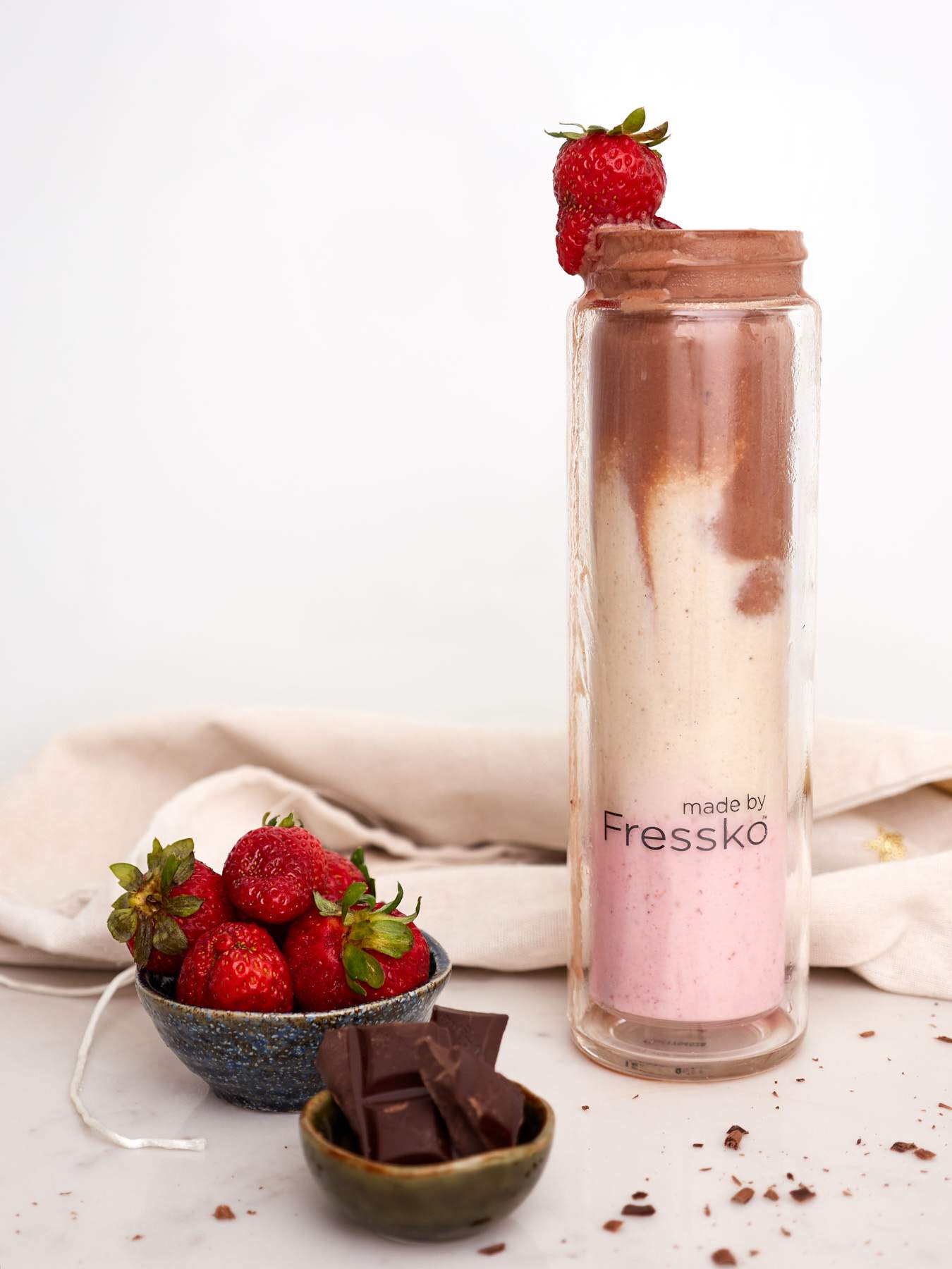 Blend the ingredients of each layer separately. Start with strawberry and carefully poured into your Fressko flask. Put the flask in the fridge while you make the next layer. Once you've made the three layers and poured them into the flask then it's ready to drink straight away! If you want to make it thicker then use more frozen fruit and less milk (and a good blender!). Then it will be like ice cream!