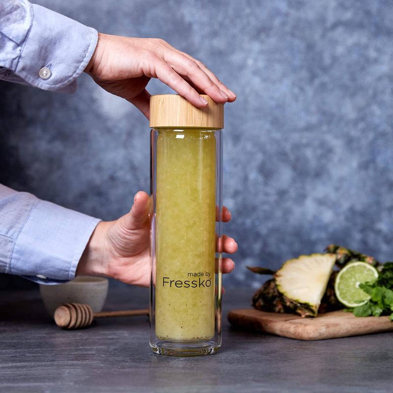 Chop the coriander leaves and place in a cocktail shaker with the lime juice, pineapple juice and a handful of ice and shake.