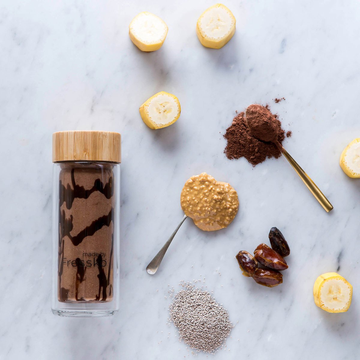 glass fressko flask with matcha banana and date smoothie