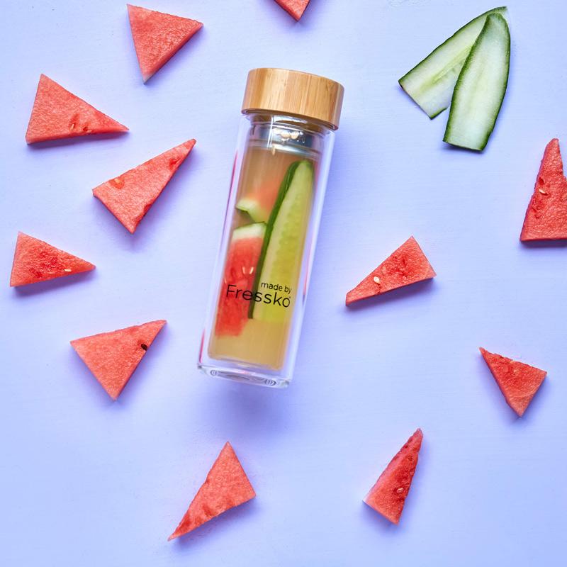 Top with water. Use the top attachment of the tea infuser to hold in watermelon and cucumber as you drink.